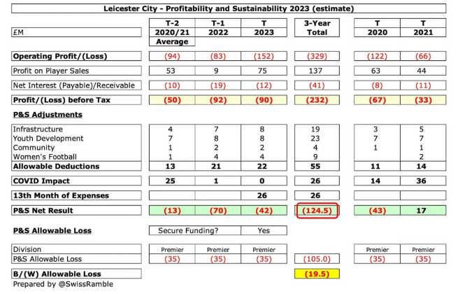莱斯特城经调整后亏损计算过程